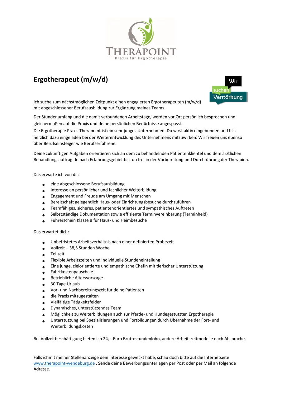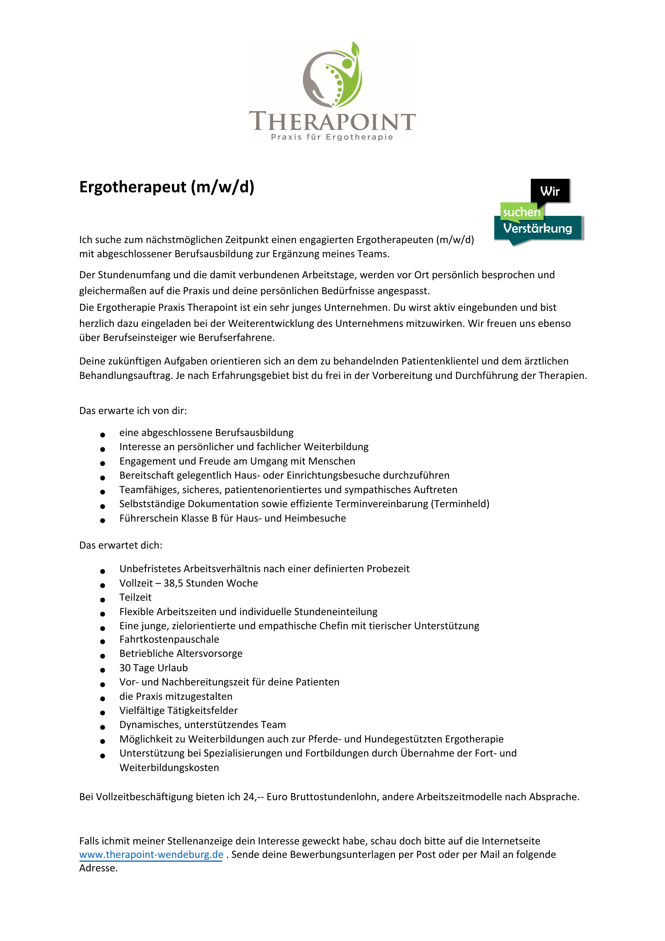 Die Ergotherapiepraxis Therapoint ist ein sehr junges Unternehmen. Du wirst aktiv eingebunden und bist herzlich dazu eingeladen, bei der Weiterentwicklung des Unternehmens mitzuwirken. Wir freuen uns sowohl über Berufseinsteiger als auch über Berufserfahrene.